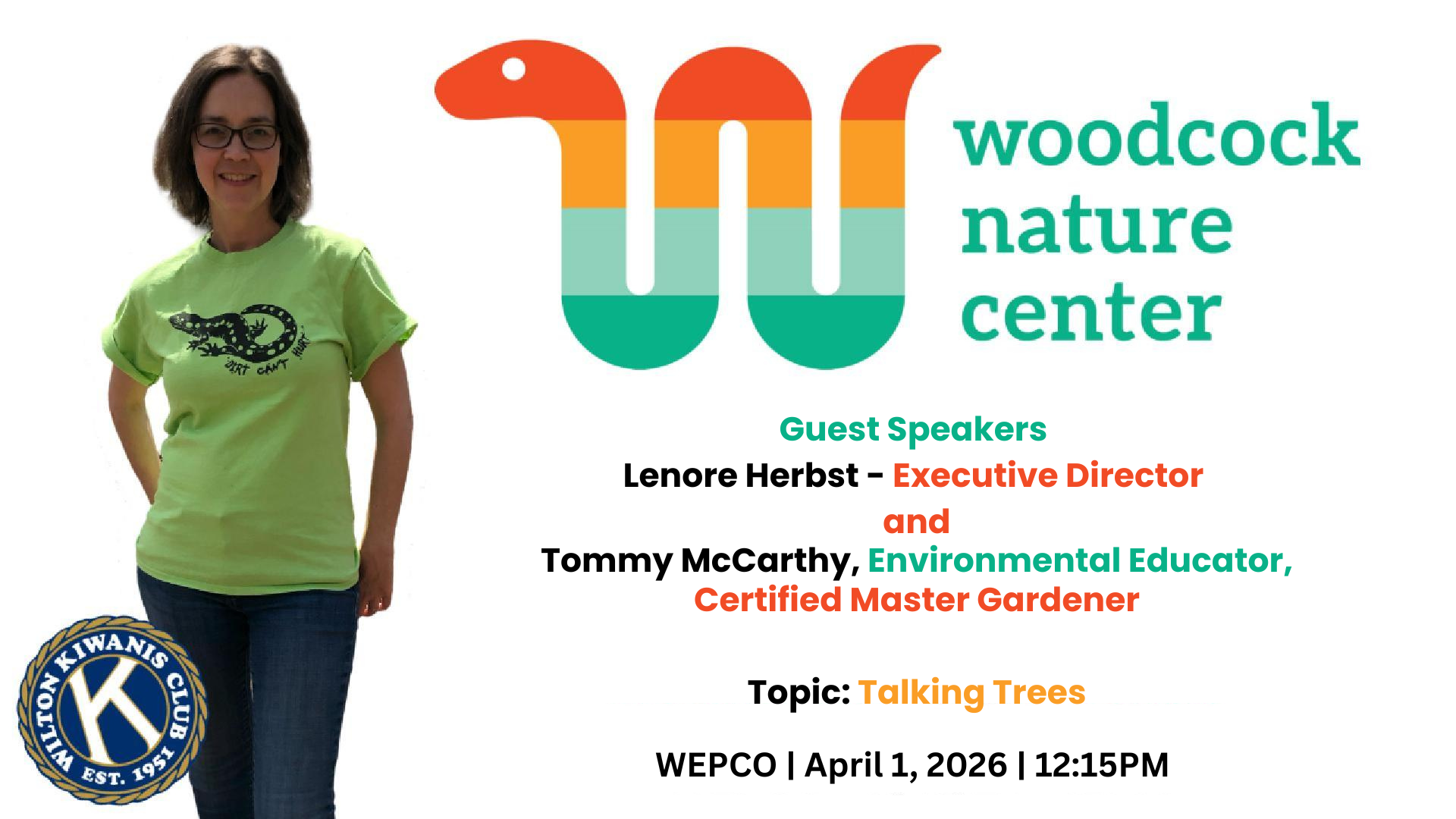 The Kiwanis Club of Wilton is pleased to welcome back Lenore Herbst of Woodcock Nature Center as our featured guest speaker. Along with Tommy McCarthy, Environmental Educator, Certified Master Gardener on Wednesday, April 1, 2026.