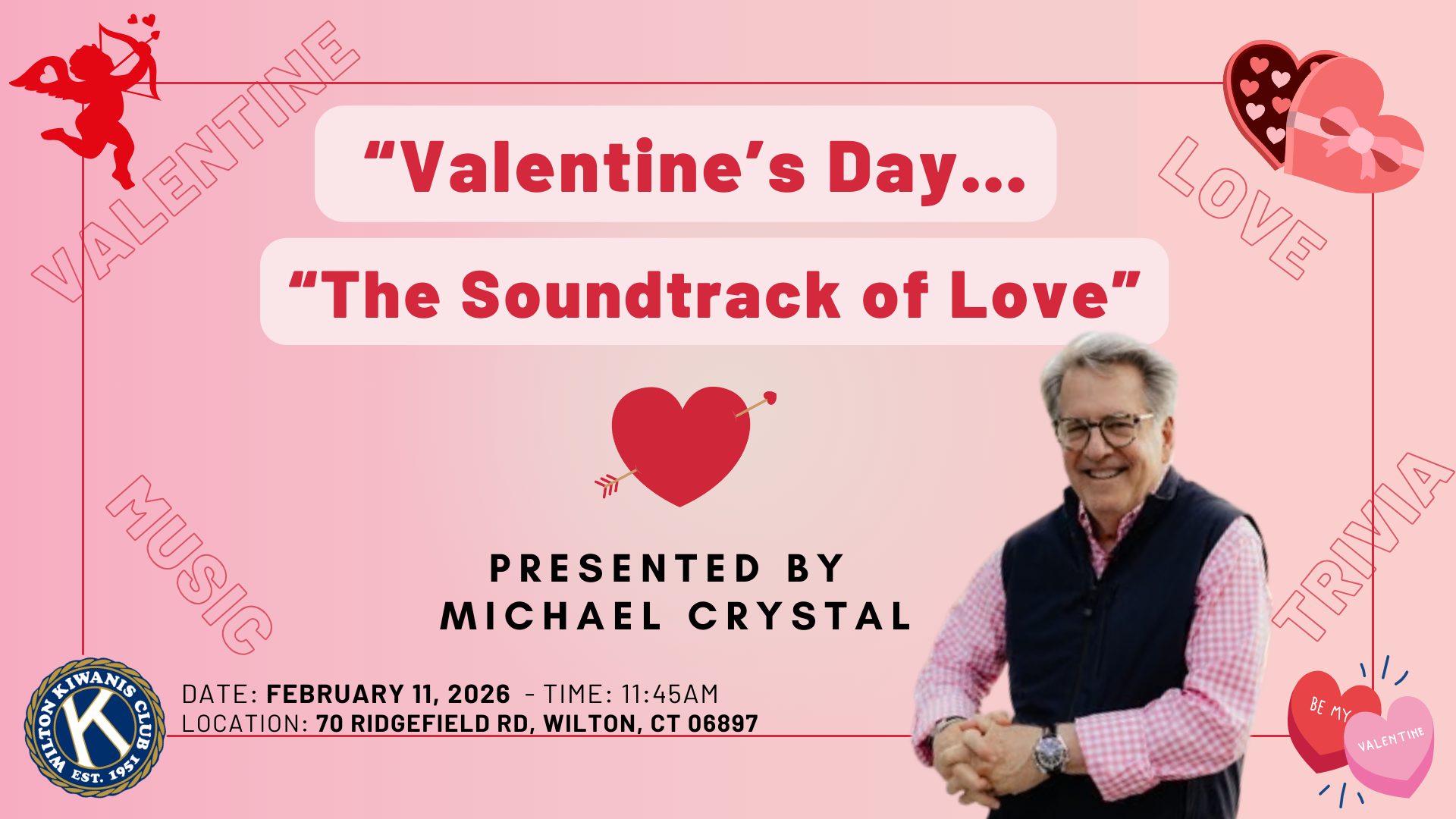 The Kiwanis Club of Wilton is delighted to welcome back Michael Crystal for another heartfelt and entertaining Valentine’s Day program. Following the great success of last year’s interactive presentation, Michael returns to share a warm, engaging Valentine’s experience that celebrates connection, joy, and community. An organizational psychologist and business performance coach, Michael has spent his career helping individuals and organizations become more successful. His work has touched hundreds of leaders across a wide range of industries, combining insight, humor, and humanity in a way that resonates with audiences.
